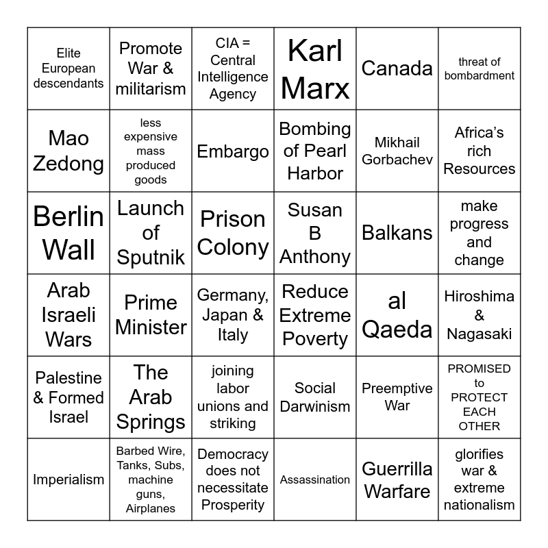 This bingo card has 63 words: Free!, Social Darwinism, Aborigines, Prime Minister, Imperialism, Nationalism, Promote War & militarism, Loss of Cottage “Home-Based” Industries, less expensive mass produced goods, preserve traditions, make progress and change, Promote War & militarism, Prison Colony, Canada, paid in silver, threat of bombardment, Africa’s rich Resources, Elite European descendants, Gained Puerto Rico, Cuba, Guam & the Philippines as colonies, Embargo, Balkans, Susan B Anthony, Karl Marx, PROMISED to PROTECT EACH OTHER, Russia France Britain, Assassination, Barbed Wire, Tanks, Subs, machine guns, Airplanes, Money (reparations), Colonies, Military & pride, joining labor unions and striking, glorifies war & extreme nationalism, Francisco Franco, Joseph Stalin, Needed to conquer places outside Japan, avoid conflict & war, Bombing of Pearl Harbor, Germany, Japan & Italy, Final Solution, Hiroshima & Nagasaki, Guerrilla Warfare, Mao Zedong, Mikhail Gorbachev, Launch of Sputnik, Mar$hall Plan, NATO, Berlin Wall, Reduce Extreme Poverty, Palestine & Formed Israel, Arab Israeli Wars, Third World = Developing Nations, Command Economies, Palestine, al Qaeda, Preemptive War, Greenhouse Gasses, John Maynard Keynes, CIA = Central Intelligence Agency, Recession, Democracy does not necessitate Prosperity, world's poorest nations, Supported Dictators, The Iranian Revolution & Theocracy, The Arab Springs and The Persian Gulf War.