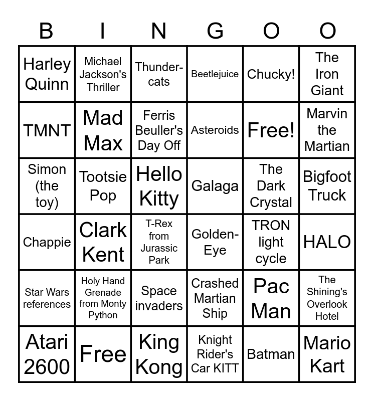 This bingo card has 42 words: Batman, Mad Max, Raider's of the Lost Ark, The Dark Crystal, HALO, Clark Kent, Simon (the toy), Mecha-godzilla, Thunder-cats, Bigfoot Truck, Hello Kitty, Asteroids, Marvin the Martian, Chucky!, Free, Chappie, The Shining's Overlook Hotel, Free!, Mario Kart, Michael Jackson's Thriller, The Iron Giant, Space invaders, Star Wars references, Harley Quinn, Robocop, Atari 2600, Ferris Beuller's Day Off, The Joker, Holy Hand Grenade from Monty Python, Pac Man, Street Fighter, Galaga, TMNT, TRON light cycle, King Kong, T-Rex from Jurassic Park, Golden-Eye, Tootsie Pop, Crashed Martian Ship, Knight Rider's Car KITT, Beetlejuice and Joust.