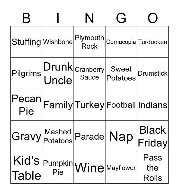 This bingo card has a free space and 24 words: Mashed Potatoes, Pumpkin Pie, Cranberry Sauce, Kid's Table, Turducken, Stuffing, Pilgrims, Wishbone, Football, Parade, Sweet Potatoes, Pecan Pie, Nap, Black Friday, Drunk Uncle, Mayflower, Indians, Plymouth Rock, Drumstick, Family, Pass the Rolls, Gravy, Cornucopia and Wine.