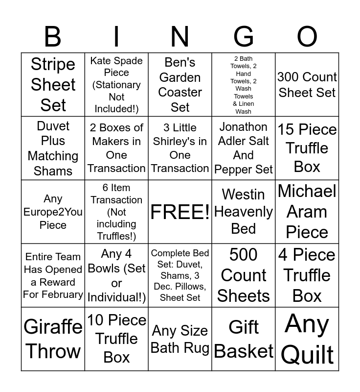 This bingo card has a free space and 24 words: Any 4 Bowls (Set or Individual!), 10 Piece Truffle Box, 3 Little Shirley's in One Transaction, Giraffe Throw, 300 Count Sheet Set, Stripe Sheet Set, Duvet Plus Matching Shams, Kate Spade Piece (Stationary Not Included!), Westin Heavenly Bed, Complete Bed Set: Duvet, Shams, 3 Dec. Pillows, Sheet Set, Jonathon Adler Salt And Pepper Set, Any Europe2You Piece, 500 Count Sheets, 4 Piece Truffle Box, 2 Boxes of Makers in One Transaction, Gift Basket, Michael Aram Piece, Ben's Garden Coaster Set, 15 Piece Truffle Box, 6 Item Transaction (Not including Truffles!), Any Quilt, Entire Team Has Opened a Reward For February, 2 Bath Towels, 2 Hand Towels, 2 Wash Towels & Linen Wash and Any Size Bath Rug.