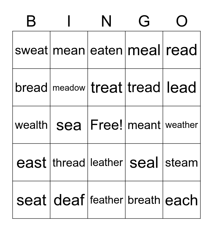 This bingo card has a free space and 24 words: thread, deaf, treat, seat, read, sweat, bread, mean, meant, leather, tread, wealth, seal, steam, meadow, breath, weather, eaten, lead, sea, each, east, meal and feather.