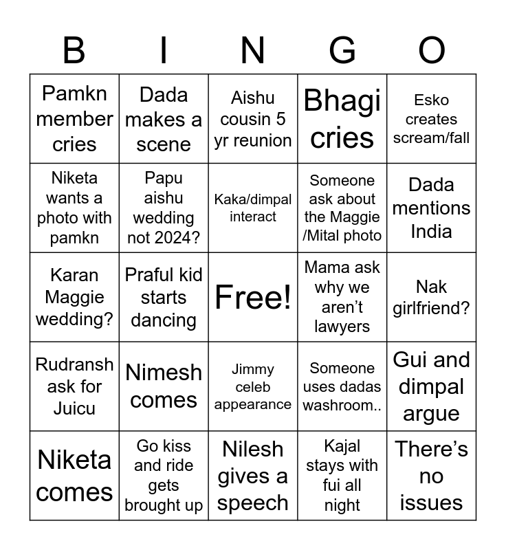 This bingo card has a free space and 24 words: Niketa comes, Nimesh comes, Kaka/dimpal interact, Kajal stays with fui all night, Esko creates scream/fall, Pamkn member cries, Dada makes a scene, Aishu cousin 5 yr reunion, Mama ask why we aren’t lawyers, Nak girlfriend?, Karan Maggie wedding?, Papu aishu wedding not 2024?, Someone uses dadas washroom.., Gui and dimpal argue, Niketa wants a photo with pamkn, Go kiss and ride gets brought up, Nilesh gives a speech, Bhagi cries, Dada mentions India, Rudransh ask for Juicu, Praful kid starts dancing, Jimmy celeb appearance, Someone ask about the Maggie /Mital photo and There’s no issues.