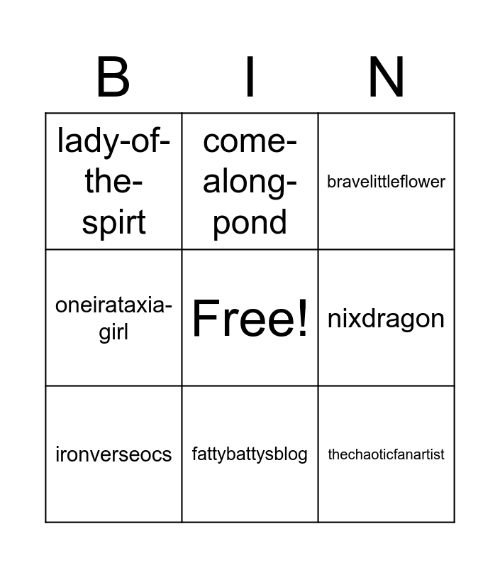 This bingo card has a free space and 8 words: nixdragon, bravelittleflower, come-along-pond, ironverseocs, lady-of-the-spirt, thechaoticfanartist, oneirataxia-girl and fattybattysblog.
