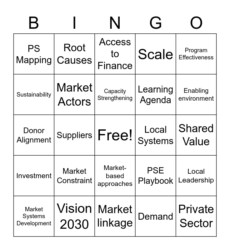 This bingo card has a free space and 24 words: Market Constraint, Vision 2030, Capacity Strengthening, Market Systems Development, Program Effectiveness, PS Mapping, Sustainability, Root Causes, Local Systems, Market-based approaches, Learning Agenda, Donor Alignment, PSE Playbook, Local Leadership, Market Actors, Demand, Shared Value, Access to Finance, Enabling environment, Suppliers, Private Sector, Investment, Scale and Market linkage.
