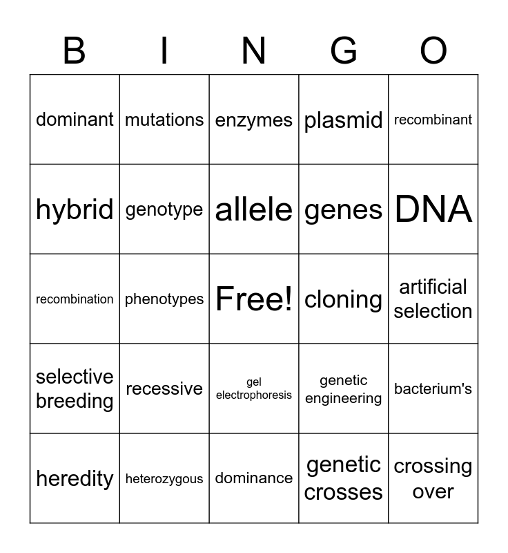 This bingo card has a free space and 24 words: recessive, heterozygous, allele, heredity, recombinant, dominant, hybrid, mutations, cloning, gel electrophoresis, genes, recombination, genetic engineering, bacterium's, genotype, genetic crosses, artificial selection, enzymes, DNA, phenotypes, crossing over, selective breeding, plasmid and dominance.