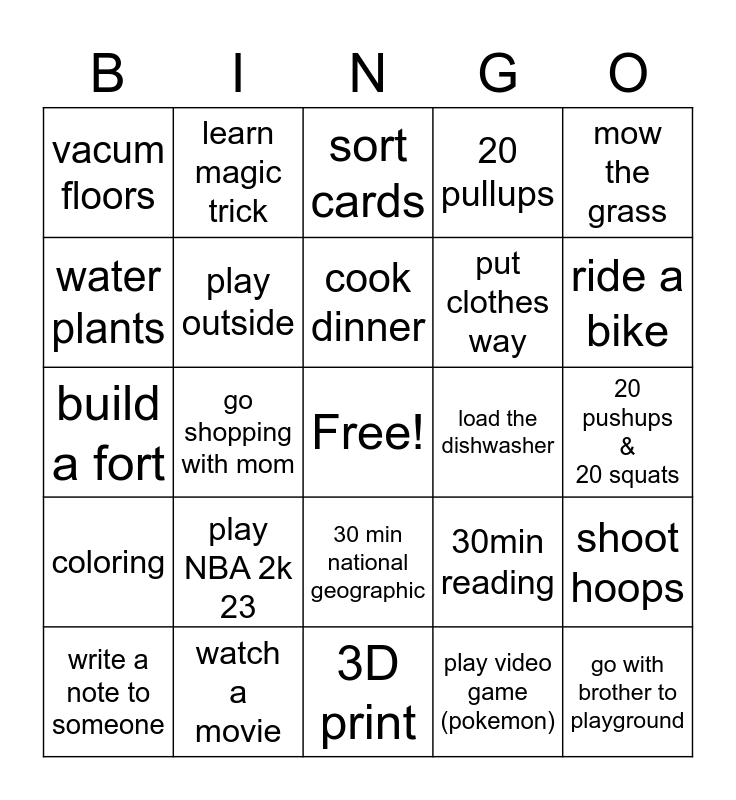 This bingo card has a free space and 24 words: play NBA 2k 23, watch a movie, cook dinner, write a note to someone, mow the grass, vacum floors, water plants, learn magic trick, load the dishwasher, 30 min national geographic, put clothes way, build a fort, 30min reading, shoot hoops, play outside, play video game (pokemon), 20 pushups & 20 squats, sort cards, ride a bike, go shopping with mom, go with brother to playground, coloring, 20 pullups and 3D print.