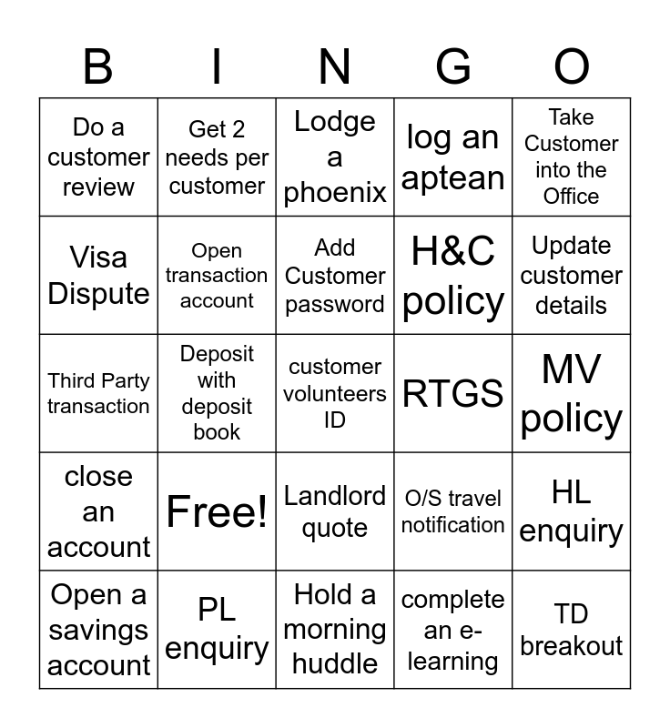 This bingo card has 25 words: Free!, Hold a morning huddle, Add Customer password, Open a savings account, Take Customer into the Office, Do a customer review, Visa Dispute, Get 2 needs per customer, RTGS, Landlord quote, H&C policy, Third Party transaction, O/S travel notification, HL enquiry, Open transaction account, TD breakout, MV policy, Lodge a phoenix, Update customer details, Deposit with deposit book, customer volunteers ID, PL enquiry, close an account, log an aptean and complete an e-learning.