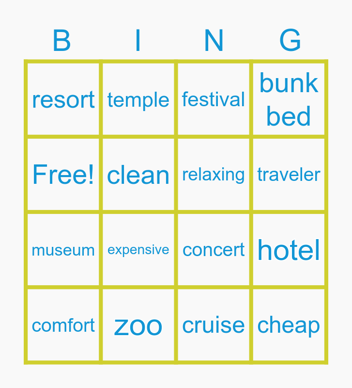 This bingo card has 16 words: zoo, hotel, festival, resort, museum, temple, concert, cruise, Free!, clean, comfort, bunk bed, expensive, traveler, relaxing and cheap.