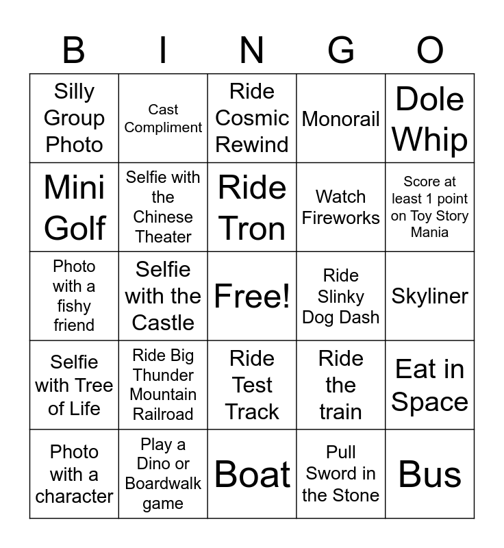 This bingo card has a free space and 33 words: Churro, Mickey Pretzel, Selfie with the Castle, Selfie with Spaceship Earth, Selfie with Tree of Life, Selfie with the Chinese Theater, Dole Whip, Photo with a character, Cast Compliment, Ice Cream, Ride Tron, Ride Cosmic Rewind, Favorite Snack, Ride Kilimanjaro Safaris, Ride Slinky Dog Dash, Score at least 1 point on Toy Story Mania, Play a Dino or Boardwalk game, Photo with a fishy friend, Ride Big Thunder Mountain Railroad, Ride the train, Ride Test Track, Selfie in World Showcase Country, Silly Group Photo, Skyliner, Boat, Bus, Monorail, Watch Fireworks, Mini Golf, Eat in Space, Pizza, Pull Sword in the Stone and Num Num Cookie.
