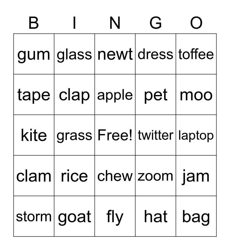 This bingo card has a free space and 39 words: candy, small, tall, clap, storm, chew, apple, dog, toffee, clam, grass, dress, bag, laptop, twitter, rice, clue, gum, coins, zoom, tape, fly, pet, moo, stomp, bed, store, champ, bee, glass, tree, week, newt, goat, hat, ink, jam, kite and owl.