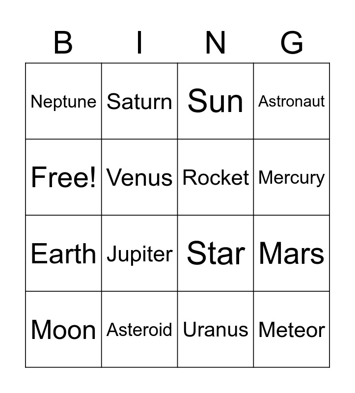 This bingo card has 16 words: Asteroid, Mars, Sun, Neptune, Earth, Saturn, Star, Uranus, Free!, Venus, Moon, Astronaut, Jupiter, Mercury, Rocket and Meteor.