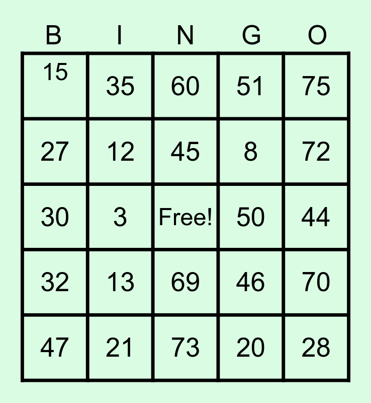 This bingo card has a free space and 24 words: 13, 21, 45, 47, 75, 15, 27, 35, 50, 69, 8, 30, 46, 70, 12, 20, 44, 60, 72, 3, 28, 32, 51 and 73.