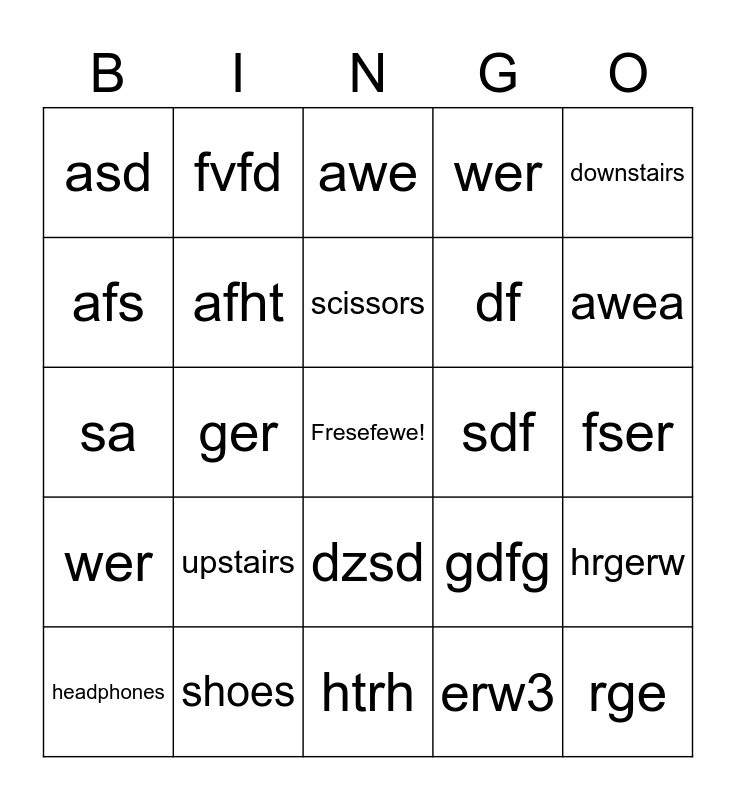 This bingo card has a free space and 24 words: upstairs, shoes, scissors, headphones, downstairs, asd, afs, fvfd, sdf, dzsd, df, sa, gdfg, hrgerw, afht, erw3, fser, awe, awea, ger, rge, wer, wer and htrh.