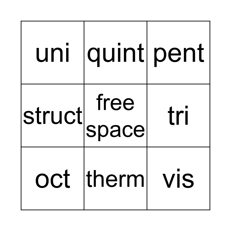 This bingo card has a free space and 8 words: tri, pent, quint, oct, uni, vis, struct and therm.