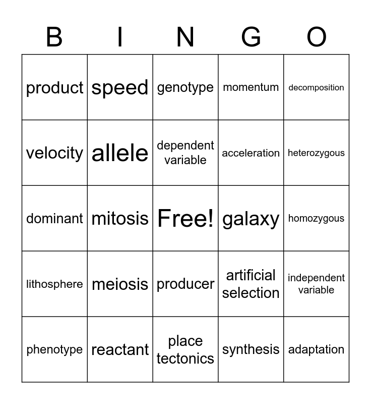 This bingo card has a free space and 29 words: phenotype, recessive, mitosis, secondary consumer, product, genotype, allele, meiosis, galaxy, reactant, homozygous, adaptation, place tectonics, synthesis, heterozygous, natural selection, producer, lithosphere, decomposition, dominant, artificial selection, primary consumer, acceleration, velocity, momentum, speed, independent variable, dependent variable and controlled variable.