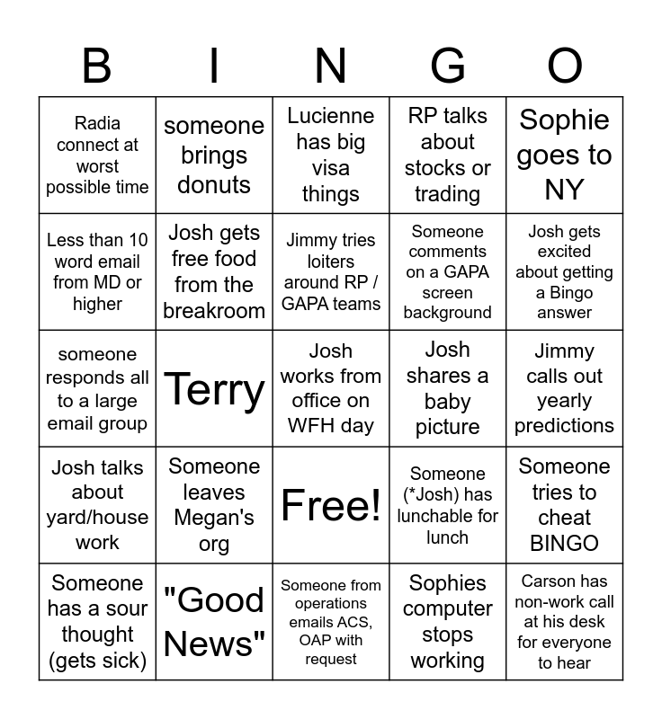 This bingo card has 26 words: Free!, Sophies computer stops working, Jimmy tries loiters around RP / GAPA teams, "Good News", Sophie goes to NY, Radia connect at worst possible time, Less than 10 word email from MD or higher, someone brings donuts, Jimmy calls out yearly predictions, Someone (*Josh) has lunchable for lunch, Someone comments on a GAPA screen background, someone responds all to a large email group, Someone tries to cheat BINGO, Someone has a sour thought (gets sick), Terry, Patrick stills our beverages, RP talks about stocks or trading, Josh talks about yard/house work, Lucienne has big visa things, Josh works from office on WFH day, Josh gets excited about getting a Bingo answer, Someone from operations emails ACS, OAP with request, Josh shares a baby picture, Someone leaves Megan's org, Josh gets free food from the breakroom and Carson has non-work call at his desk for everyone to hear.