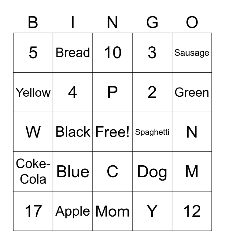 This bingo card has a free space and 86 words: A, B, C, D, E, F, G, H, I, J, K, L, M, N, O, P, Q, R, S, T, U, V, W, X, Y, Z, What, How, You, Age, Apple, Orange, Pizza, Blue, Yellow, Red, Green, Purple, White, Black, Brown, Pink, Hamburger, Spaghetti, Eggs, Sausage, Bacon, Bread, Ice Cream, Milk, Soda Pop, Pepsi, Coke-Cola, Sprite, Mountain Dew, McDonalds, 1, 2, 3, 4, 5, 6, 7, 8, 9, 10, 11, 12, 13, 14, 15, 16, 17, 18, 19, 20, Mom, Dad, Brother, Sister, Man, Woman, Girl, Boy, Dog and Cat.