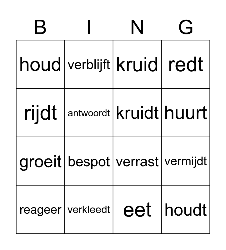 This bingo card has 20 words: vermijdt, wacht, kruid, overlegt, reageer, rijdt, verkleedt, houd, groeit, verblijft, bespot, verrast, antwoordt, houdt, kruidt, loop, huurt, redt, eet and krijgt.