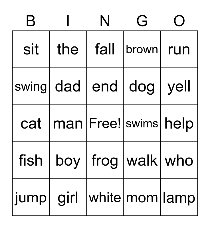 This bingo card has a free space and 24 words: boy, girl, end, jump, run, sit, swing, the, swims, frog, dog, cat, walk, who, dad, mom, help, fall, yell, man, lamp, fish, brown and white.