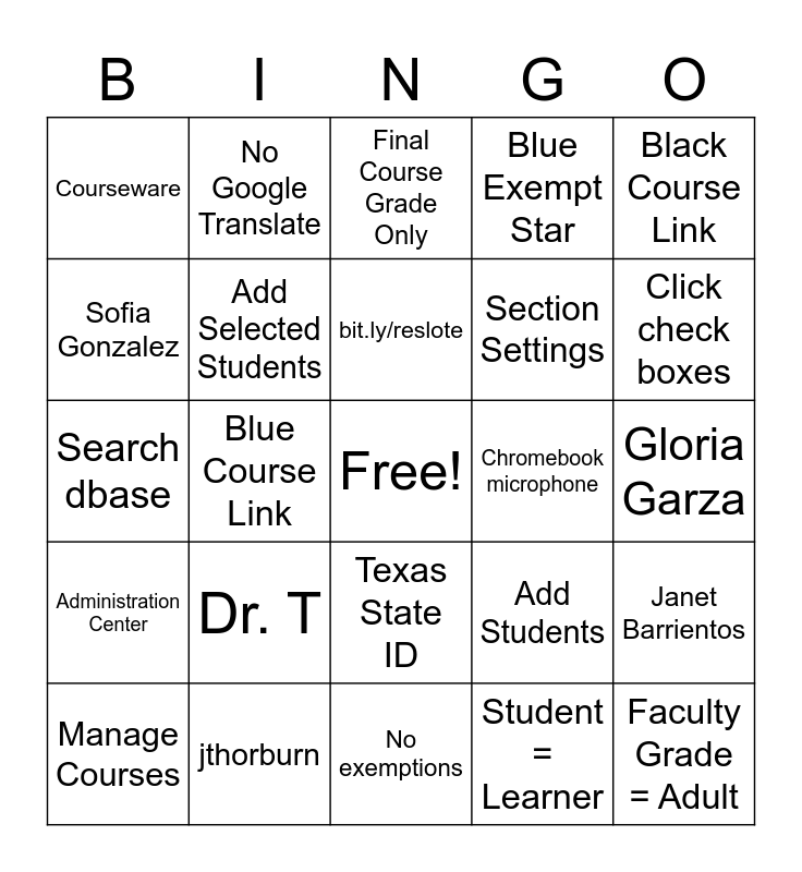 This bingo card has a free space and 36 words: 1 pretest attempt, 3 Blue Dots, Account = restx, Add Selected Students, Add Students, Administration Center, bit.ly/reslote, bit.ly/reslotepres, Black Course Link, Blue Circle Complete, Blue Course Link, Blue Exempt Star, Check Proper School, Chromebook microphone, Click check boxes, Courseware, Create a User, Dr. T, Faculty Grade = Adult, Final Course Grade Only, Gloria Garza, Janet Barrientos, jthorburn, Manage Courses, No exemptions, No Google Translate, Search dbase, Section Actions, Section Settings, Sofia Gonzalez, Staff = Program Administrator, Start early, Student = Learner, Texas State ID, White Circle Not Started and Write 5 sentences.