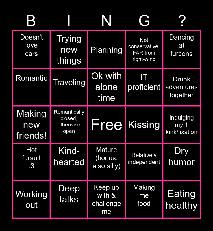 This bingo card has a free space and 24 words: Working out, Kind-hearted, Ok with alone time, Making me food, Dancing at furcons, Doesn't love cars, Trying new things, Planning, Kissing, Indulging my 1 kink/fixation, Making new friends!, Traveling, Relatively independent, Dry humor, Romantic, Deep talks, Keep up with & challenge me, Not conservative, FAR from right-wing, Drunk adventures together, Hot fursuit :3, Romantically closed, otherwise open, Mature (bonus: also silly), IT proficient and Eating healthy.