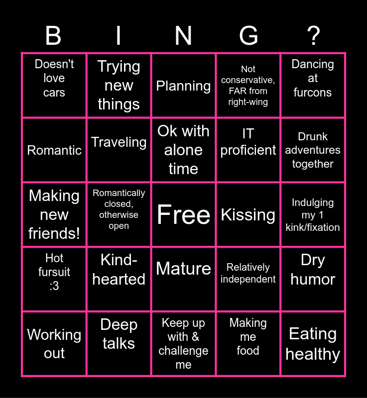 This bingo card has a free space and 24 words: Working out, Kind-hearted, Ok with alone time, Making me food, Dancing at furcons, Doesn't love cars, Trying new things, Planning, Kissing, Indulging my 1 kink/fixation, Making new friends!, Traveling, Relatively independent, Dry humor, Romantic, Deep talks, Keep up with & challenge me, Not conservative, FAR from right-wing, Drunk adventures together, Hot fursuit :3, Romantically closed, otherwise open, Mature, IT proficient and Eating healthy.