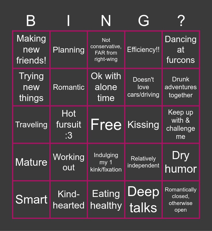 This bingo card has a free space and 24 words: Working out, Kind-hearted, Ok with alone time, Smart, Dancing at furcons, Making new friends!, Trying new things, Planning, Kissing, Indulging my 1 kink/fixation, Doesn't love cars/driving, Traveling, Relatively independent, Dry humor, Romantic, Deep talks, Keep up with & challenge me, Not conservative, FAR from right-wing, Drunk adventures together, Hot fursuit :3, Romantically closed, otherwise open, Mature, Efficiency!! and Eating healthy.