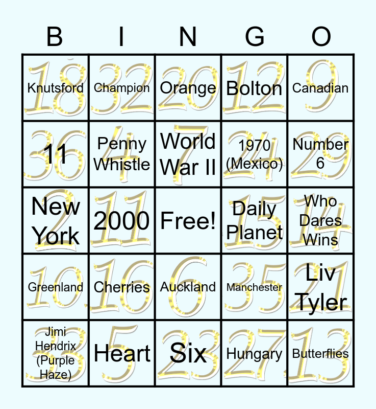 This bingo card has 41 images, a free space and 41 words: Adriatic, New York, Anne Hathaway, Penny Whistle, Heart, Auckland, World War II, Meadowhall, Canadian, Greenland, 2000, Bolton, Butterflies, Who Dares Wins, Daily Planet, Cherries, Both assassinated Presidents, Knutsford, Apollo 11, Orange, Liv Tyler, Portugal, Six, 1970 (Mexico), Fulham, Rotherham United, Hungary, Barnsley, Blackpool, and Swindon, Number 6, Brian Clough, Peru, Champion, Jimi Hendrix (Purple Haze), In Pain, Manchester, 11, Awful Auntie, Dutch, Black truffles, Blackadder and Abba.