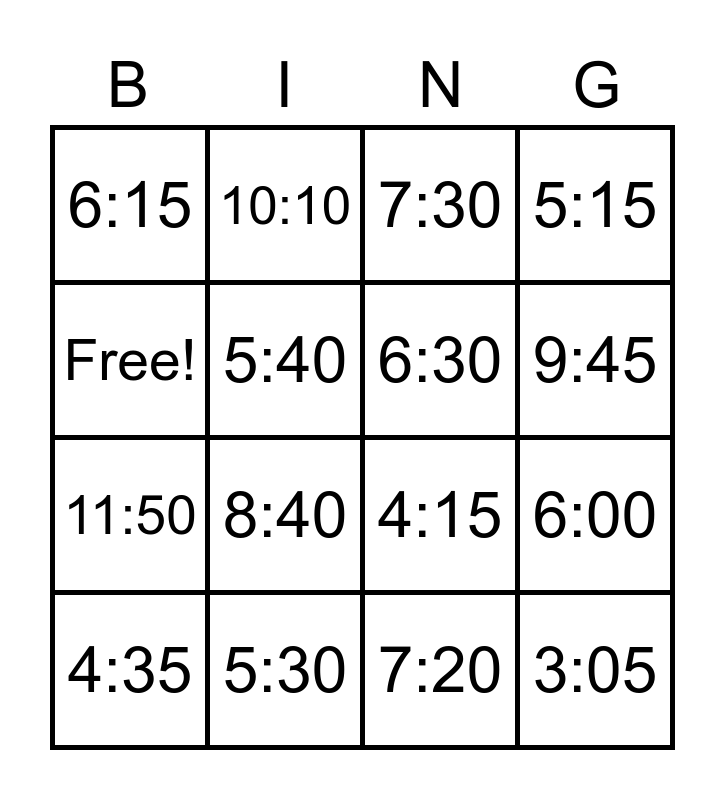 This bingo card has 16 words: 5:30, 6:00, 7:30, 6:15, 11:50, 10:10, 4:15, 7:20, Free!, 5:40, 4:35, 5:15, 8:40, 9:45, 6:30 and 3:05.