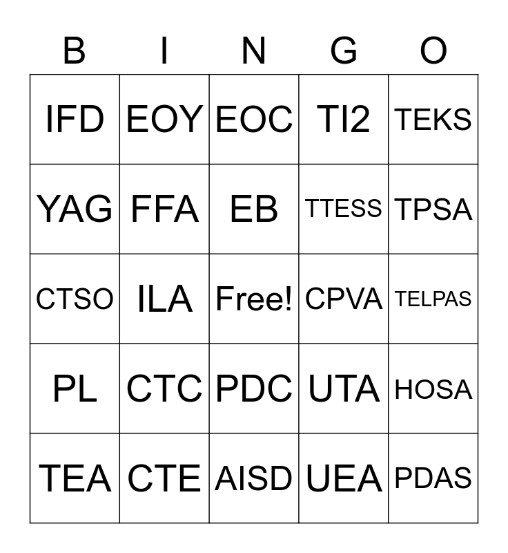 This bingo card has a free space and 24 words: CTC, CTE, EB, TEA, TEKS, IFD, YAG, EOY, CPVA, PDC, TTESS, CTSO, UTA, HOSA, FFA, UEA, TELPAS, EOC, TPSA, ILA, PDAS, PL, TI2 and AISD.