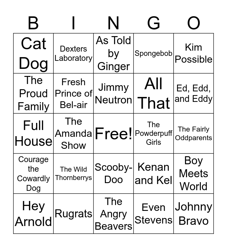 This bingo card has a free space and 24 words: The Wild Thornberrys, Rugrats, Jimmy Neutron, Hey Arnold, Kim Possible, Cat Dog, The Proud Family, Dexters Laboratory, The Powderpuff Girls, Scooby-Doo, All That, Full House, Kenan and Kel, Boy Meets World, Fresh Prince of Bel-air, Even Stevens, The Fairly Oddparents, As Told by Ginger, Ed, Edd, and Eddy, The Amanda Show, Johnny Bravo, Courage the Cowardly Dog, Spongebob and The Angry Beavers.