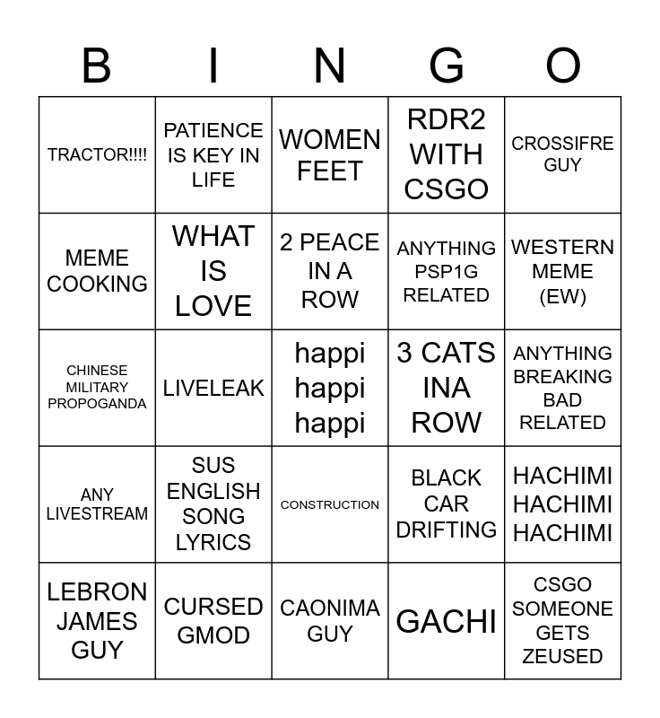 This bingo card has a free space and 24 words: SUS ENGLISH SONG LYRICS, CURSED GMOD, 2 PEACE IN A ROW, LEBRON JAMES GUY, CROSSIFRE GUY, TRACTOR!!!!, MEME COOKING, PATIENCE IS KEY IN LIFE, 3 CATS INA ROW, CONSTRUCTION, ANYTHING PSP1G RELATED, CHINESE MILITARY PROPOGANDA, BLACK CAR DRIFTING, HACHIMI HACHIMI HACHIMI, WHAT IS LOVE, GACHI, ANYTHING BREAKING BAD RELATED, WOMEN FEET, WESTERN MEME (EW), LIVELEAK, CSGO SOMEONE GETS ZEUSED, ANY LIVESTREAM, RDR2 WITH CSGO and CAONIMA GUY.