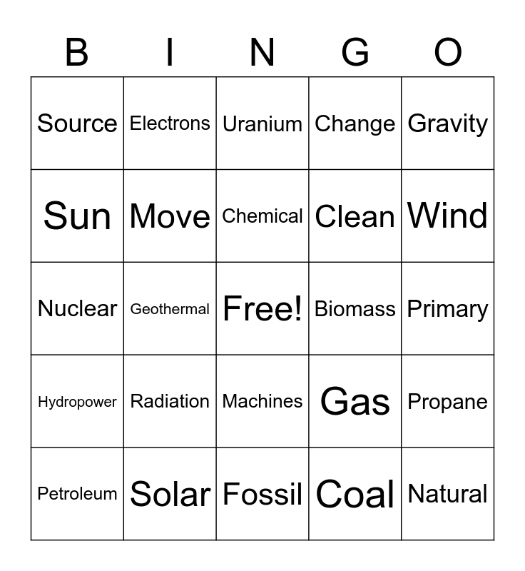 This bingo card has a free space and 35 words: Light, Heat, Grow, Move, Machines, Change, Sun, Fire, Chemical, Elastic, Nuclear, Gravity, Electricity, Electromanic, Source, Biomass, Coal, Geothermal, Hydropower, Natural, Gas, Petroleum, Propane, Solar, Uranium, Wind, Renewable, Non-Renewable, Clean, Primary, Secondary, Fossil, Radiation, Electrons and Magnets.