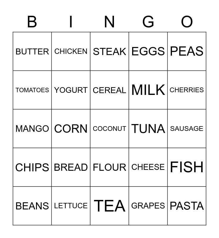 This bingo card has 29 words: BEANS, CUCUMBER, CORN, PASTA, BUTTER, STEAK, YOGURT, BREAD, TUNA, LETTUCE, SAUSAGE, COCONUT, TEA, GRAPES, CHERRIES, HOT DOG, FLOUR, CHIPS, PEAS, MANGO, CHEESE, ORANGES, MILK, TOMATOES, EGGS, CHICKEN, FISH, CEREAL and CHOCOLATE.