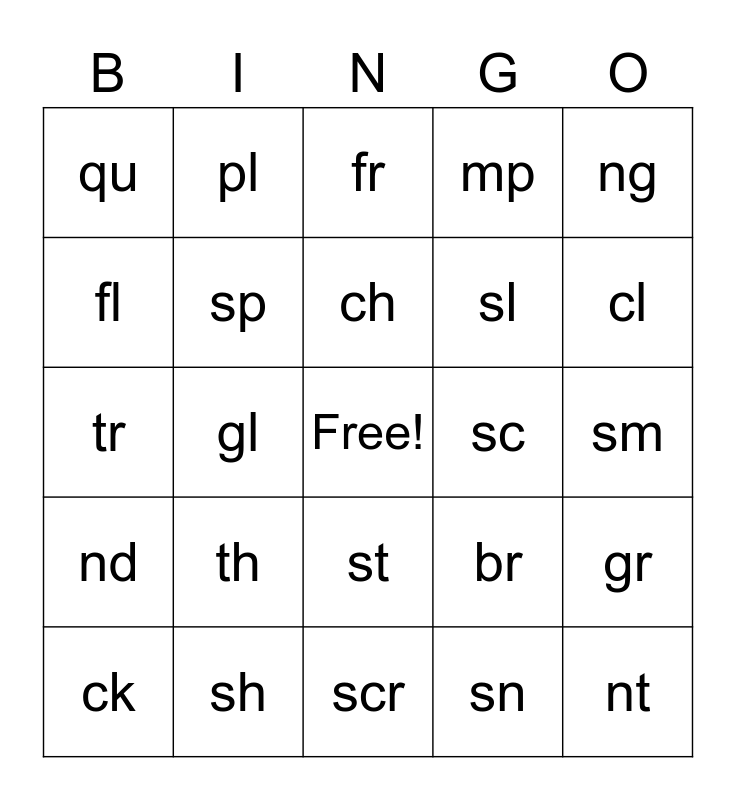 This bingo card has a free space and 24 words: th, sh, ch, ck, ng, qu, fl, pl, sc, st, sl, tr, br, gr, sp, sn, sm, fr, cl, gl, nt, nd, mp and scr.