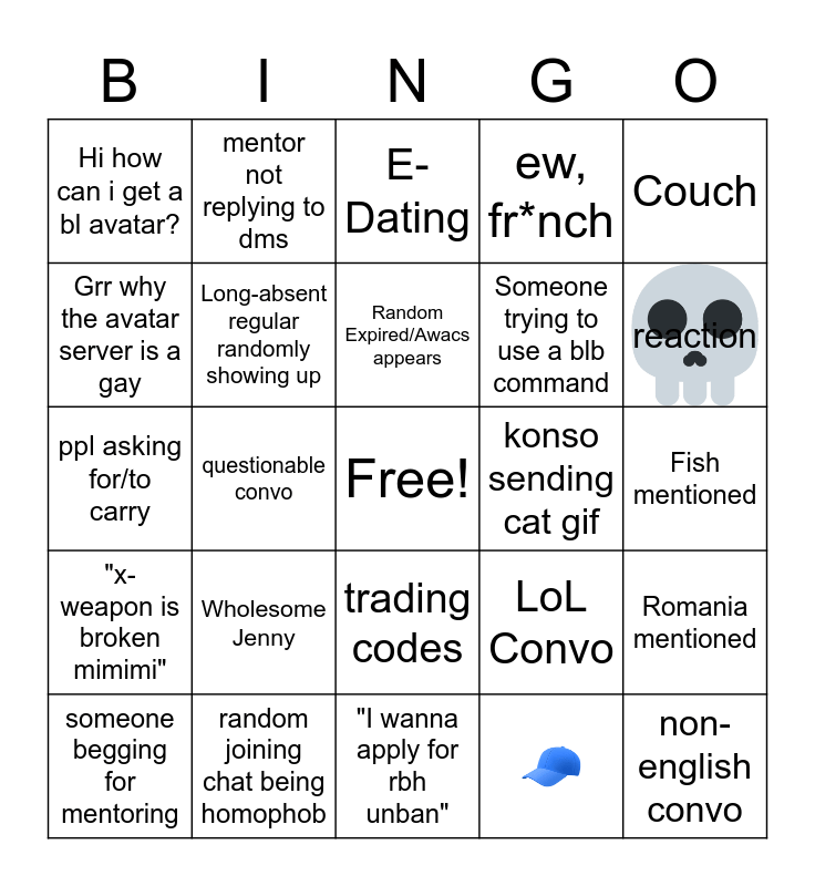 This bingo card has 2 images, a free space and 23 words: Wholesome Jenny, random joining chat being homophob, Random Expired/Awacs appears, someone begging for mentoring, Couch, Hi how can i get a bl avatar?, Grr why the avatar server is a gay, mentor not replying to dms, konso sending cat gif, trading codes, Someone trying to use a blb command, ppl asking for/to carry, LoL Convo, Romania mentioned, Long-absent regular randomly showing up, Fish mentioned, E-Dating, reaction, questionable convo, non-english convo, "x-weapon is broken mimimi", ew, fr*nch and "I wanna apply for rbh unban".