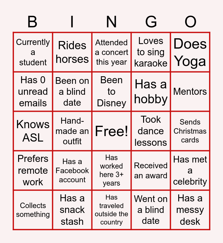 This bingo card has a free space and 89 words: Has a birthday this month, Is a lefty, Has traveled outside the country, Can play an instrument, Has a tattoo, Can speak a foreign language, Played on a school sports team, watches reality television, Had braces, Has broken a bone, Has lived in another state/country, Hates Math, Loves to sing karaoke, Has met a celebrity, Has a pet, Has a Facebook account, grew up in this city, Went on a blind date, Vegetarian, Extrovert, Will read 10+ books this year, Volunteers regularly, Has a hobby, Works out regularly, Knows ASL, Appeared in a movie, Met a celebrity, Has an unusual family tradition, Loves true crime podcasts, Likes pineapple on pizza, Been on a blind date, Been to Disney, Loves roller coasters, Does Yoga, Can do a cartwheel, Rides horses, Attended a concert this year, Has been to the Olympics, Sends Christmas cards, Screams during scary movies, Loves karaoke, Can hula hoop, Has been skydiving, Won an eating competition, Collects something, Goes all-out on holiday decorating, Recently handmade a gift, Received an award, Has performed in public, Currently a student, Travels often, Named after a relative, Has a scar, Speaks 2+ languages, Worked at a family business, Visited 4+ continents, Had a long-distance relationship, Took dance lessons, Climbed a mountain, Gardens, Traveled in the last year, Can bake a cake from scratch, Owns cryptocurrency, Knows calligraphy, Can drive stick, Has taken a cruise, Won a race, Watches documentaries, Has a messy desk, Prefers remote work, Has a snack stash, Has worked here 3+ years, Has a favorite pen, Mentors, Has 0 unread emails, Prefers working in the morning, Prefers working at night, Works out, Read 10+ books this year, Lived in another country, Hand-made an outfit, Plays an instrument, Has been scuba diving, Attends religious services, Wears contacts, Grew up in this city, Has a hidden talent, Creates art and Has a sweet tooth.