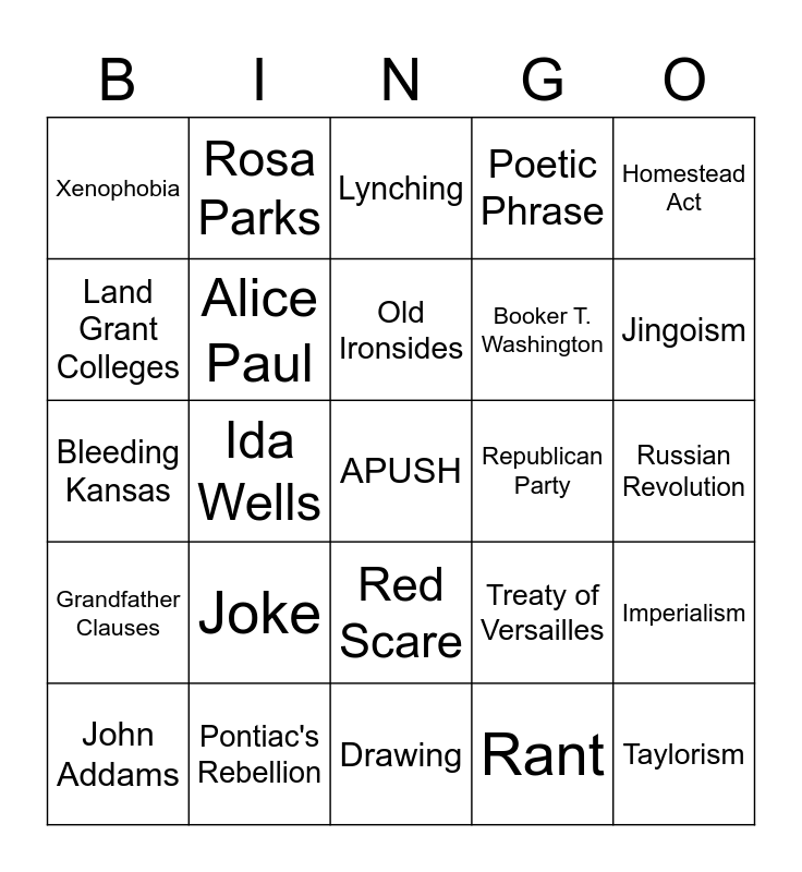 This bingo card has a free space and 24 words: Joke, Pontiac's Rebellion, Old Ironsides, John Addams, Homestead Act, Xenophobia, Land Grant Colleges, Rosa Parks, Republican Party, Red Scare, Booker T. Washington, Bleeding Kansas, Treaty of Versailles, Imperialism, Alice Paul, Rant, Russian Revolution, Lynching, Jingoism, Ida Wells, Taylorism, Grandfather Clauses, Poetic Phrase and Drawing.