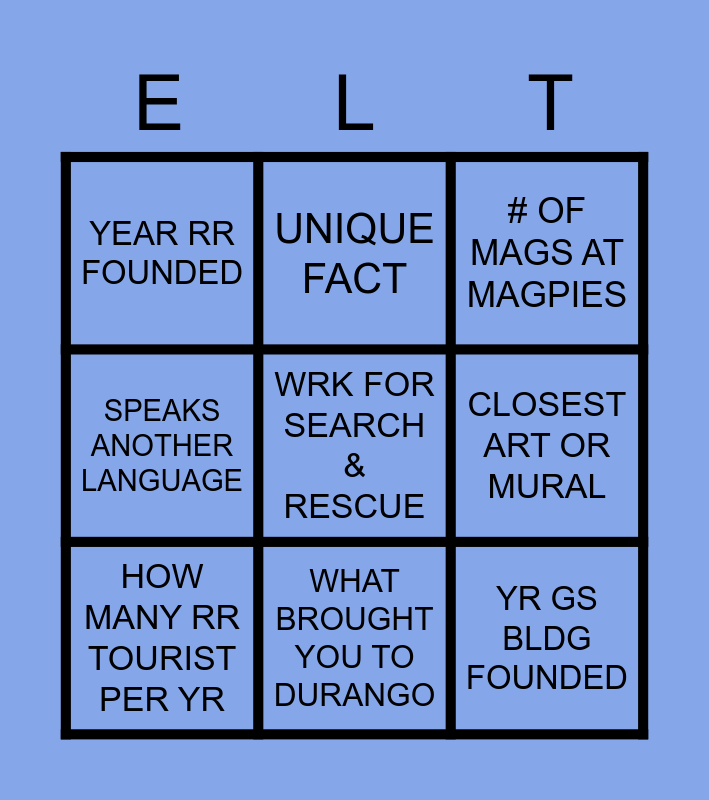This bingo card has 9 words: HOW MANY RR TOURIST PER YR, # OF MAGS AT MAGPIES, UNIQUE FACT, SPEAKS ANOTHER LANGUAGE, YEAR RR FOUNDED, CLOSEST ART OR MURAL, WRK FOR SEARCH & RESCUE, YR GS BLDG FOUNDED and WHAT BROUGHT YOU TO DURANGO.