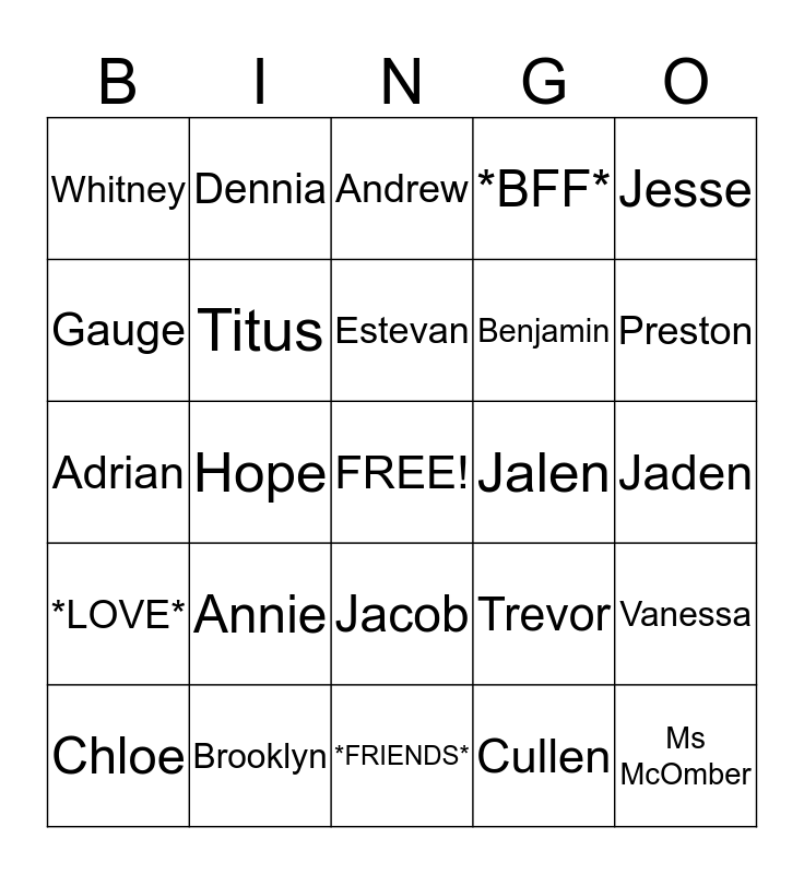 This bingo card has a free space and 24 words: Annie, Brooklyn, Estevan, Chloe, Jesse, Whitney, Gauge, Dennia, Jalen, Jacob, Benjamin, Adrian, Trevor, Vanessa, Titus, Cullen, Jaden, Andrew, Preston, Hope, Ms McOmber, *LOVE*, *BFF* and *FRIENDS*.