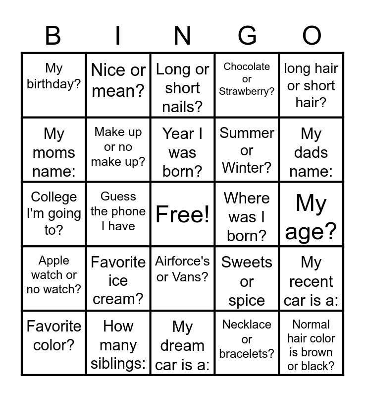 This bingo card has a free space and 24 words: Favorite color?, Favorite ice cream?, Year I was born?, Necklace or bracelets?, long hair or short hair?, My birthday?, Nice or mean?, Long or short nails?, Where was I born?, My age?, College I'm going to?, Make up or no make up?, Sweets or spice, My recent car is a:, My moms name:, How many siblings:, My dream car is a:, Chocolate or Strawberry?, My dads name:, Apple watch or no watch?, Guess the phone I have, Airforce's or Vans?, Summer or Winter? and Normal hair color is brown or black?.