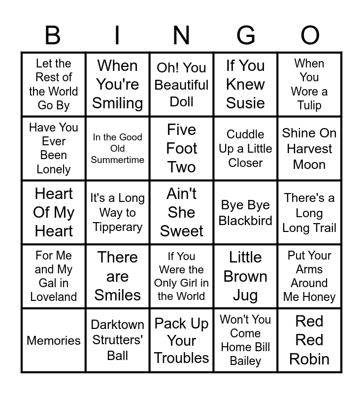 This bingo card has 31 words: Pack Up Your Troubles, Let Me Call You Sweetheart, It's a Long Way to Tipperary, 4 Leaf Clover, Let the Rest of the World Go By, Oh! You Beautiful Doll, In the Good Old Summertime, Little Brown Jug, Bye Bye Blackbird, Won't You Come Home Bill Bailey, There's a Long Long Trail, Ain't She Sweet, Red Red Robin, Side by Side, Shine On Harvest Moon, K-K-Katy, Put Your Arms Around Me Honey, There are Smiles, For Me and My Gal in Loveland, If You Were the Only Girl in the World, When You Wore a Tulip, Hello My Baby, Memories, When You're Smiling, Cuddle Up a Little Closer, Have You Ever Been Lonely, If You Knew Susie, Heart Of My Heart, Darktown Strutters' Ball, Five Foot Two and Sentimental Journey.
