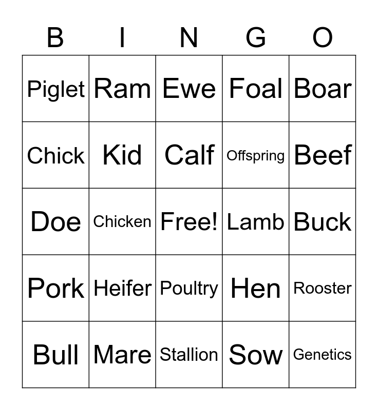 This bingo card has a free space and 24 words: Bull, Heifer, Calf, Sow, Boar, Piglet, Ram, Ewe, Lamb, Buck, Doe, Kid, Hen, Rooster, Chick, Mare, Stallion, Foal, Beef, Pork, Chicken, Poultry, Offspring and Genetics.