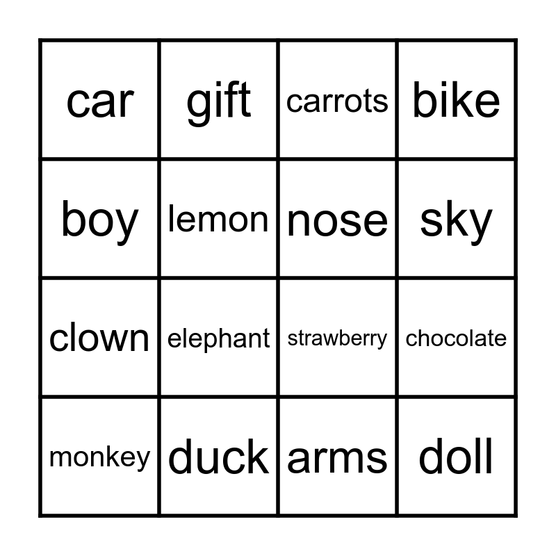 This bingo card has 70 words: apple, arms, baby, bag, ball, bananas, bike, book, boy, bread, broccoli, cake, car, carrots, cheese, chocolate, Christmas, clown, cow, doll, duck, eggs, elephant, eraser, eyes, family, feet, fish, football, frog, gift, giraffe, girl, grandma, grandpa, hands, hat, ice-cream, legs, lemon, meat, milk, monkey, mouse, mouth, nose, orange, pears, pencil, rain, rice, ruler, salad, Sharpener, shoes, shower, sky, snake, snow, socks, strawberry, summer, tomato, towel, train, t-shirt, watermelon, wind, window and winter.