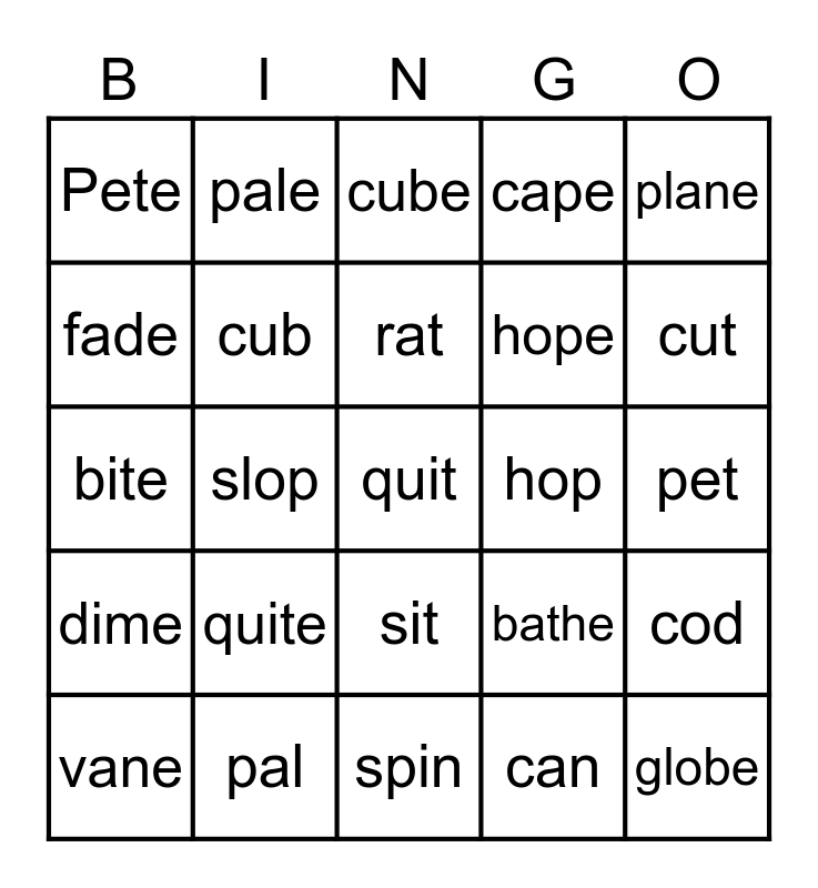 This bingo card has a free space and 64 words: slim, fat, scrape, cod, pip, pin, pale, use, rat, kite, sit, van, pet, plane, made, fade, slop, Pete, robe, hope, quite, dime, cape, strip, cane, code, plan, mad, tape, kit, rate, fate, bath, us, cut, vane, stripe, can, tap, cub, bite, hop, cute, shad, rob, globe, pal, dim, bathe, rid, pine, glob, spin, cap, slope, bit, cube, shade, fad, slime, scrap, ride, spine and site.