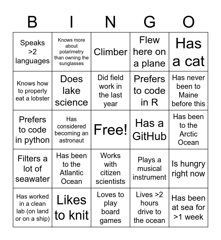 This bingo card has a free space and 46 words: Dog person, Has been at sea for >1 week, Knows a magic trick, Loves to play board games, Has been to the Atlantic Ocean, Has been to the Pacific Ocean, Knows more about polarimetry than owning the sunglasses, Prefers to code in MATLAB, Knows how to properly eat a lobster, Has met a famous person, Does lake science, Flew here on a plane, Is hungry right now, Plays a musical instrument, Scuba dives, Does not like pizza, Did field work in the last year, Has a GitHub, Star wars fan, Has a cat, Has considered becoming an astronaut, Lives >2 hours drive to the ocean, Speaks >2 languages, Prefers to code in R, Can tell a field work disaster story, Has never been to Maine before this, Has worked in a clean lab (on land or on a ship), Went to or is going to a wedding this summer, Works with citizen scientists, Filters a lot of seawater, Wants to teach, Loves to paddleboard, Does a lot of outreach, Models, Has been to the Southern Ocean, Likes to knit, Has been to the Arctic Ocean, Has used a secchi disk, Has done airborne science, Has considered becoming an astronaut, Works with lidar, Climber, Prefers to code in python, Has been to a concert in last month, Studied Latin or Greek and Star trek fan.
