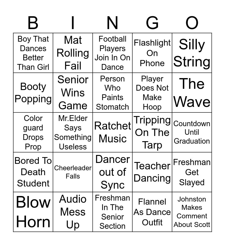 This bingo card has a free space and 24 words: Cheerleader Falls, Audio Mess Up, Person Who Paints Stomatch, Blow Horn, Silly String, Boy That Dances Better Than Girl, Booty Popping, Mat Rolling Fail, Tripping On The Tarp, Dancer out of Sync, Player Does Not Make Hoop, Color guard Drops Prop, Teacher Dancing, Freshman Get Slayed, Senior Wins Game, Flannel As Dance Outfit, Countdown Until Graduation, Football Players Join In On Dance, The Wave, Mr.Elder Says Something Useless, Johnston Makes Comment About Scott, Bored To Death Student, Flashlight On Phone and Freshman In The Senior Section.