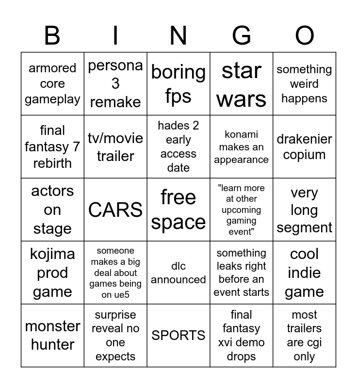 This bingo card has a free space and 24 words: someone makes a big deal about games being on ue5, surprise reveal no one expects, hades 2 early access date, monster hunter, something weird happens, armored core gameplay, final fantasy 7 rebirth, persona 3 remake, "learn more at other upcoming gaming event", dlc announced, konami makes an appearance, actors on stage, something leaks right before an event starts, cool indie game, tv/movie trailer, final fantasy xvi demo drops, very long segment, boring fps, drakenier copium, CARS, most trailers are cgi only, kojima prod game, star wars and SPORTS.