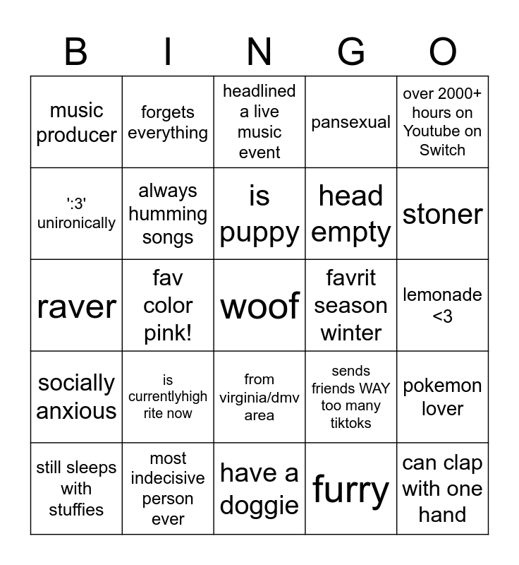This bingo card has a free space and 24 words: is currentlyhigh rite now, most indecisive person ever, is puppy, still sleeps with stuffies, over 2000+ hours on Youtube on Switch, music producer, ':3' unironically, forgets everything, favrit season winter, from virginia/dmv area, head empty, raver, sends friends WAY too many tiktoks, pokemon lover, always humming songs, furry, lemonade <3, headlined a live music event, stoner, fav color pink!, can clap with one hand, socially anxious, pansexual and have a doggie.