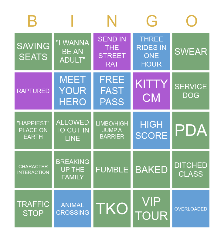 This bingo card has 25 words: BREAKING UP THE FAMILY, TKO, FREE FAST PASS, TRAFFIC STOP, SWEAR, SAVING SEATS, RAPTURED, "I WANNA BE AN ADULT", HIGH SCORE, FUMBLE, KITTY CM, "HAPPIEST" PLACE ON EARTH, BAKED, DITCHED CLASS, MEET YOUR HERO, OVERLOADED, PDA, SEND IN THE STREET RAT, SERVICE DOG, ALLOWED TO CUT IN LINE, LIMBO/HIGH JUMP A BARRIER, ANIMAL CROSSING, CHARACTER INTERACTION, THREE RIDES IN ONE HOUR and VIP TOUR.